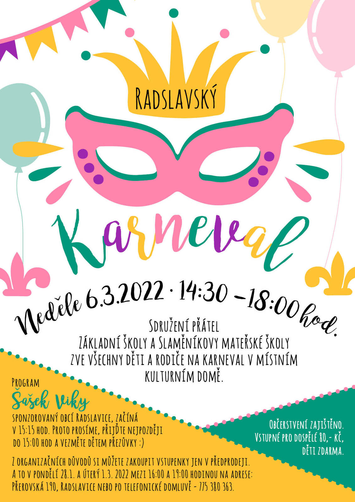 Sdružení přátel Základní školy a Slaměníkovy mateřské školy zve všechny děti a rodiče na karneval v místním Kulturním domě v neděli 06.03.2022 od 14.30-18.00hod. Bližší informace naleznete v příloze.