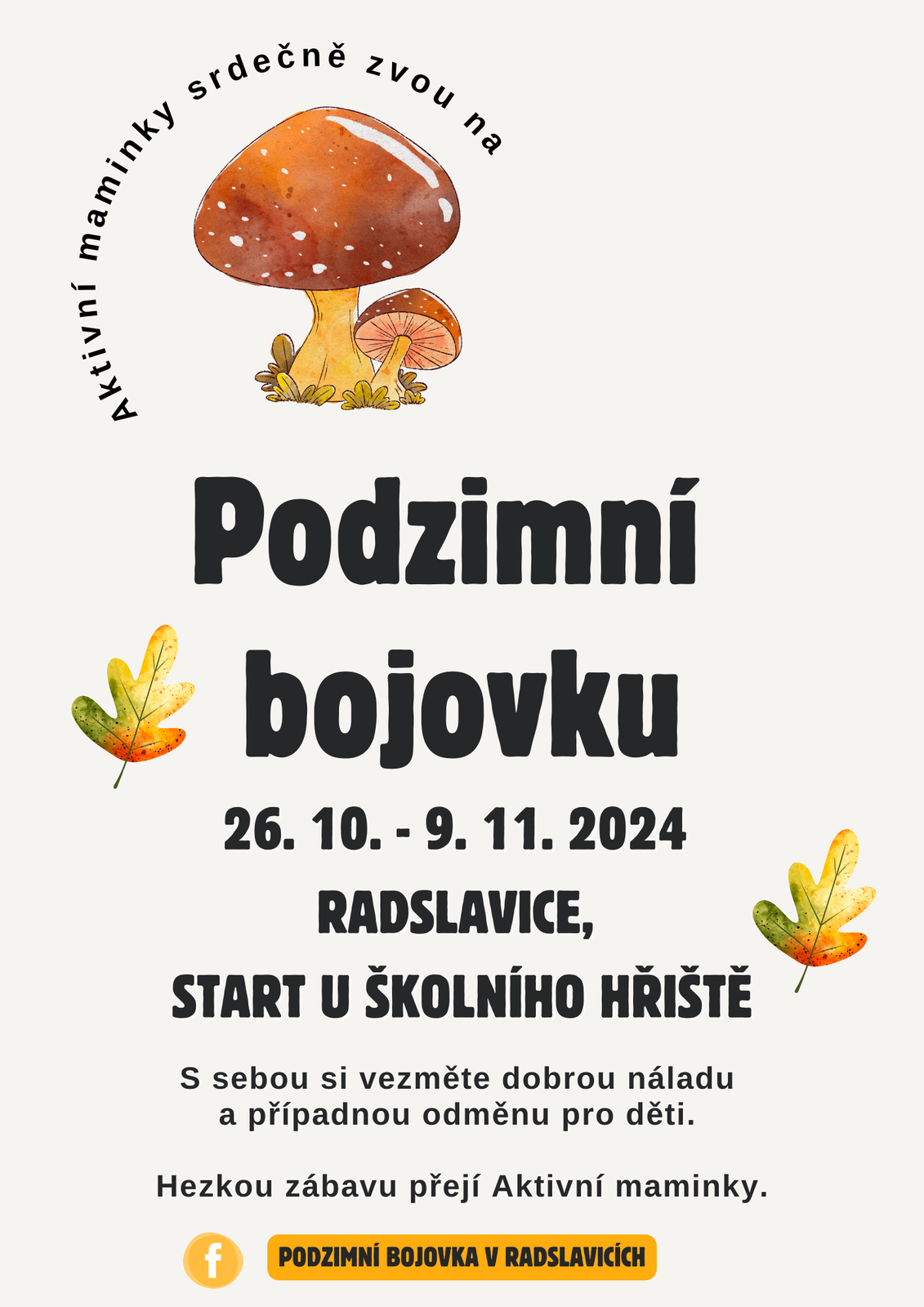 Aktivní maminky srdečně zvou všechny na Podzimní stezku, která začíná u školního hřiště. S sebou potřebujete jen dobrou náladu a případnou odměnu za splnění stezky.