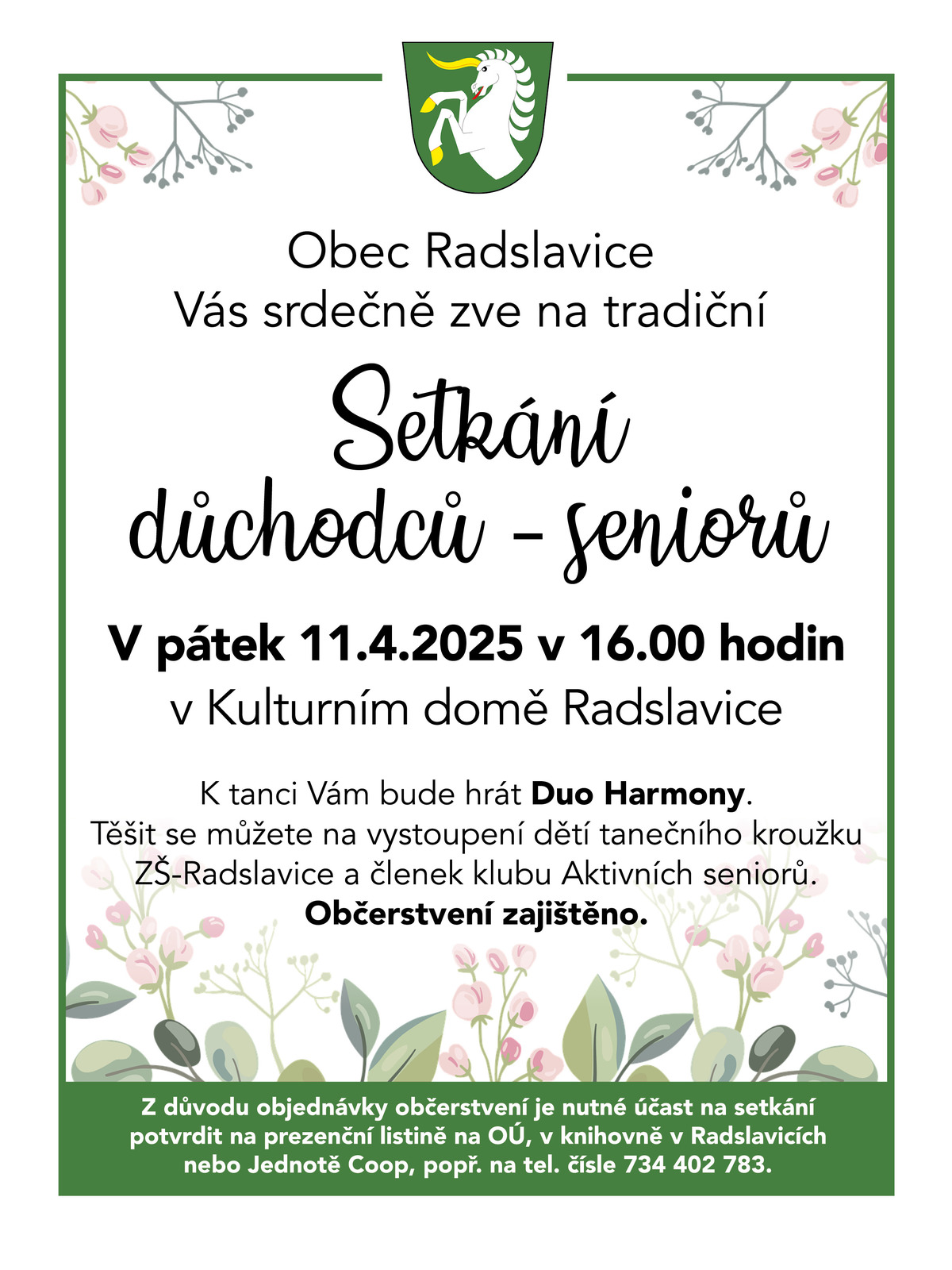 Obec Radslavice zve seniory na tradiční jarní setkání, které se uskuteční v pátek 11.4.2025 od 16 hodin v Kulturním domě Radslavice. K tanci bude hrát Duo Harmony, vystoupí děti tanečního kroužku ZŠ Radslavice a klub aktivních seniorů. Z důvodu objednávky občerstvení je nutné účast potvrdit na prezenční listině na OU, v knihovně nebo prodejně COOP, popř. na tel. čísle 734 402 783. V případě zájmu o dovoz je nutno nahlásit se na telefonu 724 193 800. Bližší informace v příloze.