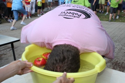 Účastní se celé družstvo. Jedná se o vylovení jablek ústy bez pomoci rukou z lavoru naplněného vodou. Každý z týmu vyloví jedno jablko. Rozhoduje dosažený čas.