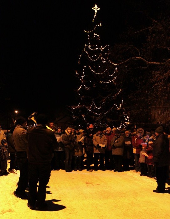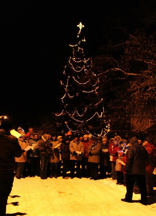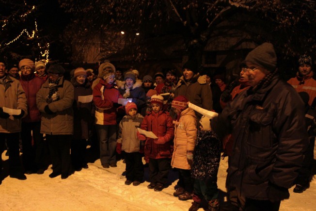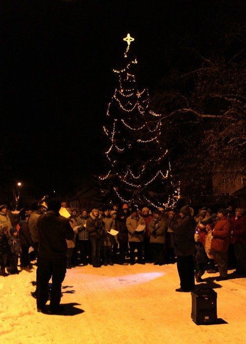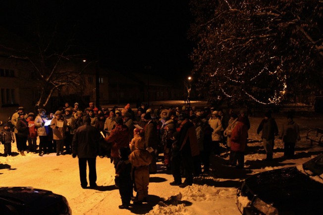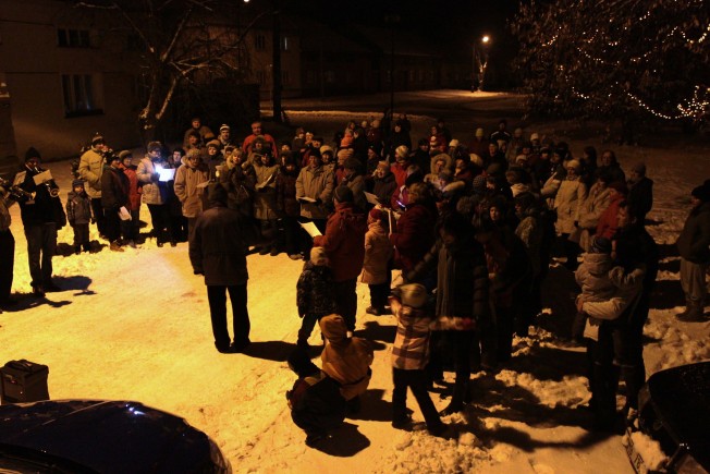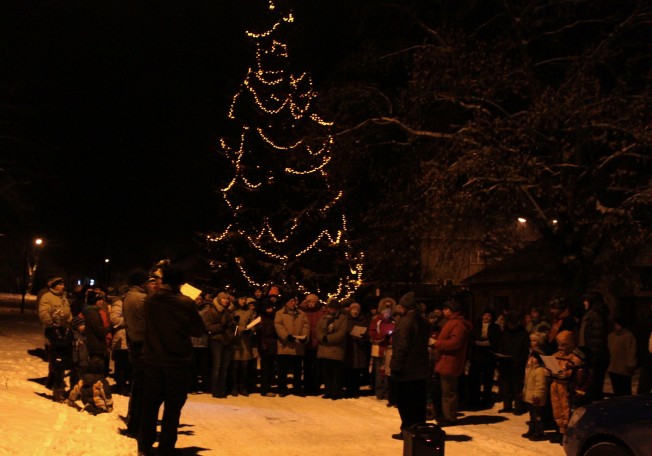 Vytvořili jsme společný sbor doprovázený třemi hudebníky na dechové nástroje. Sladit všechny hlasy se pokusil vedoucí místního kostelního sboru pan Karel Lukáš a sólistka téhož sboru Svatava Mrázková. Zpívali jsme pět vybraných koled z natištěných zpěvníčků, které jsme na místě rozdávali. Po odzpívání pan starosta odměnil přítomné pohárkem léku proti nastydnutí –domácí slivovičkou a děti dostaly bonbónky. Rozutekli jsme se brzy, protože nás mrazivé počasí popohánělo k návratu do tepla svých příbytků. Popřát si navzájem krásné Vánoce jsme si však před tím stihli.